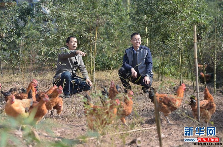 李寶強(右)在一戶百姓家了解林下養(yǎng)雞情況(2015年11月25日攝)。李寶強,眉山市青神縣瑞峰鎮(zhèn)天池村“第一書記”。為集中力量打好脫貧攻堅戰(zhàn),四川省選派1.5萬名優(yōu)秀機關干部到建檔立卡貧困村任職“第一書記”。黨的十八大以來,以習近平同志為總書記的黨中央高瞻遠矚、深謀遠慮,以高度的政治感、使命感和責任感,把扶貧開發(fā)工作提升至治國理政新高度,廣泛凝聚社會各界力量,推進實施精準扶貧方略,為到2020年全面建成小康社會奠定堅實基礎。按照中央部署,通過產(chǎn)業(yè)扶持、轉(zhuǎn)移就業(yè)、易地搬遷、政策兜底等方式,到2020年將實現(xiàn)7017萬農(nóng)村貧困人口脫貧目標。新華社記者 薛玉斌 攝