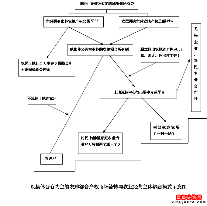 李錄堂向《西部大開(kāi)發(fā)》介紹,董家?guī)X村示范項(xiàng)目探索建立“以土地集體公有為主,非集體(農(nóng)民)土地所有為輔”的土地集體公有制,通過(guò)土地承包經(jīng)營(yíng)控制權(quán)比例化市場(chǎng)流轉(zhuǎn)試驗(yàn),組建土地股份合作社、家庭農(nóng)場(chǎng)和專(zhuān)業(yè)大戶(hù)等經(jīng)營(yíng)主體,實(shí)行規(guī)?;s化經(jīng)營(yíng),進(jìn)而科學(xué)地解決人多地少條件下土地產(chǎn)權(quán)市場(chǎng)化可能產(chǎn)生的社會(huì)不穩(wěn)定因素以及農(nóng)民農(nóng)地產(chǎn)權(quán)自由進(jìn)入和退出問(wèn)題,讓農(nóng)民“退出土地”有保障,“進(jìn)入土地”有支持,徹底消除農(nóng)民流轉(zhuǎn)土地的后顧之憂(yōu),形成“以公有制為主體具有雙重保障的農(nóng)地市場(chǎng)流轉(zhuǎn)機(jī)制”。這一農(nóng)村土地改革的新思路是遵照“以公有制為主體,多種所有制經(jīng)濟(jì)成分并存”的《憲法》原則,借鑒國(guó)有企業(yè)劃分國(guó)有股、企業(yè)股和企業(yè)全員持股的經(jīng)驗(yàn)及城鎮(zhèn)住房公積金改革的做法,將農(nóng)地產(chǎn)權(quán)(農(nóng)地承包經(jīng)營(yíng)使用權(quán)等)在集體和農(nóng)民之間按集體占51%,農(nóng)民占49%的比例混合分配后再市場(chǎng)化流轉(zhuǎn)。其中集體所占農(nóng)地產(chǎn)權(quán)及收益總額的51%主要用于農(nóng)民土地社會(huì)保障金和農(nóng)地規(guī)模化公積金,以解決農(nóng)地市場(chǎng)流轉(zhuǎn)過(guò)程中失地失業(yè)農(nóng)民的生存和就業(yè)保障問(wèn)題,其余49%的收益歸農(nóng)民個(gè)人所有,進(jìn)而形成既能保證農(nóng)地集體所有制主導(dǎo)地位,又具有雙重保障和穩(wěn)定性的農(nóng)地產(chǎn)權(quán)市場(chǎng)流轉(zhuǎn)機(jī)制。