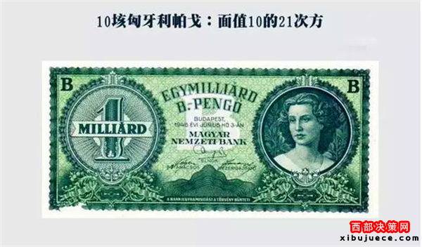 匈牙利帕戈在第二次世界大戰(zhàn)后失去價值,遭受到紀錄上有史以來最嚴重的貨幣貶值,物價飛漲到了無法控制的地步,計價時需要用到極高的位數(shù),面值10垓帕戈的鈔票,舊匈牙利的鈔票,面值是100,000,000,000,000,000,000,也就是10的21次方帕戈(可能紙幣上實在放不下這么多0,所以面額是用文字表示的)。