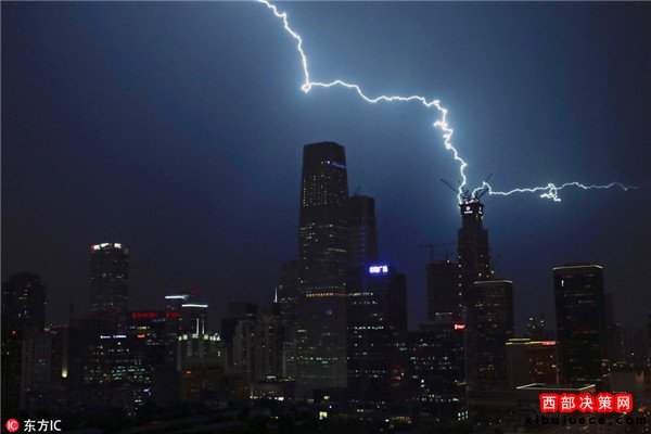 2016年9月7日,中國北京,夜幕降臨,一道道打雷閃電劃破京城夜空,觸目驚心。據(jù)北京市氣象局官方微博消息,北京市氣象臺7日17時45分發(fā)布雷電黃色預(yù)警信號。