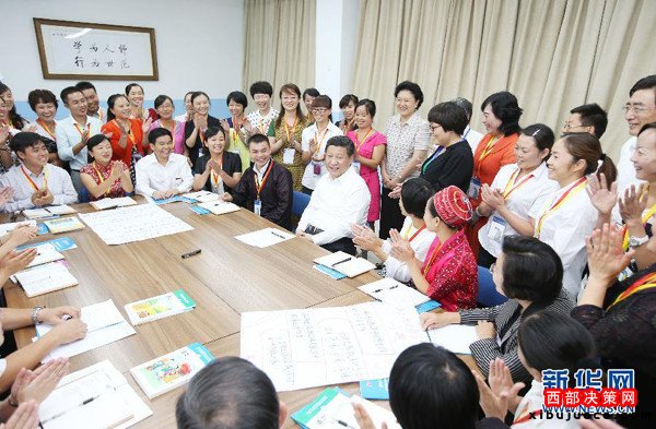 (2014年9月9日,習近平來到北京師范大學看望教師學生,向全國廣大教師和教育工作者致以崇高的節(jié)日敬禮和祝賀。這是習近平同正在北師大參加“中小學教師國家級培訓計劃”的貴州小學骨干語文教師交流。新華社記者姚大偉攝)