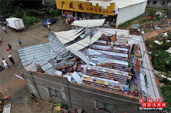 9月15日,今年第14號臺風“莫蘭蒂”于凌晨3時05分在廈門翔安區(qū)沿海登陸,登陸時中心附近最大風力15級(48米/秒,強臺風級),中心氣壓945百帕,給翔安當?shù)貛韲乐負p失。圖為翔安一超市被摧毀。