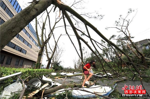 9月15日,今年第14號臺風“莫蘭蒂”于凌晨3時05分在廈門翔安沿海登陸,登陸時中心附近最大風力15級(48米/秒,強臺風級),中心氣壓945百帕。圖為廈門市區(qū)路上大批車輛被吹倒的樹木損壞。
