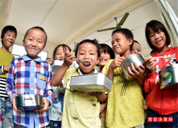 10月10日,在廣西大化瑤族自治縣七百弄鄉(xiāng)弄雄小學(xué),同學(xué)們?cè)诔誀I(yíng)養(yǎng)餐。