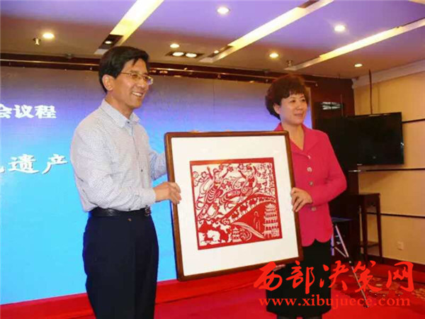 平?jīng)鍪姓笔虚L李生發(fā)向參會各?。▍^(qū))代表贈送平?jīng)黾艏埶囆g(shù)作品