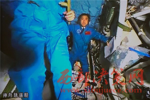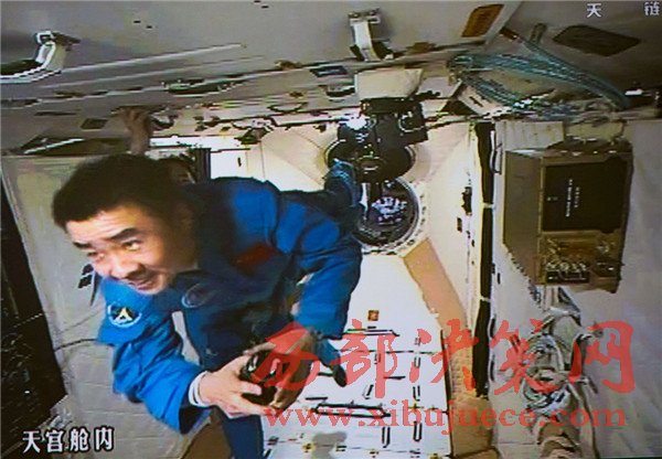 10月19日,神舟十一號(hào)航天員景海鵬和陳冬順利進(jìn)入天宮二號(hào)實(shí)驗(yàn)艙。景海鵬(左)和陳冬在天宮二號(hào)實(shí)驗(yàn)艙向全國(guó)人民問好并敬禮(攝于北京航天飛行控制中心大屏幕)。