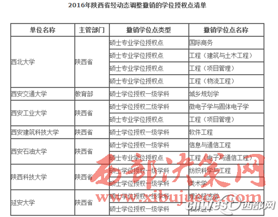 2016年陜西省經(jīng)動(dòng)態(tài)調(diào)整撤銷(xiāo)的學(xué)位授權(quán)點(diǎn)清單包括,西北大學(xué)的國(guó)際商務(wù)、西安交通大學(xué)的城鄉(xiāng)規(guī)劃學(xué)等7所大學(xué)的14個(gè)碩士專(zhuān)業(yè)學(xué)位授權(quán)點(diǎn)和碩士學(xué)位授權(quán)一級(jí)學(xué)科。