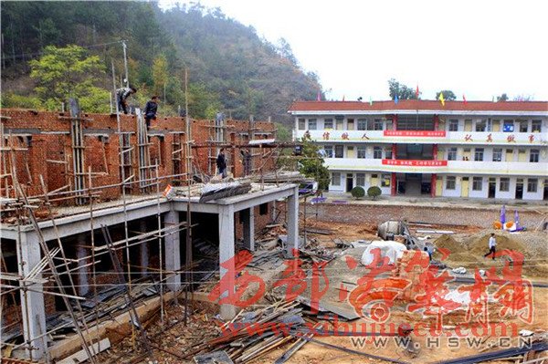 10月20日上午,在山陽(yáng)縣高壩店鎮(zhèn)石橋村小學(xué),偌大的操場(chǎng)中間用一堵墻隔成兩半,一半是學(xué)生活動(dòng)場(chǎng)所,另一半是一棟剛剛建設(shè)的村委會(huì)辦公樓。學(xué)校的一、三樓用于村委會(huì)、教職工辦公休息,二層學(xué)生上課。