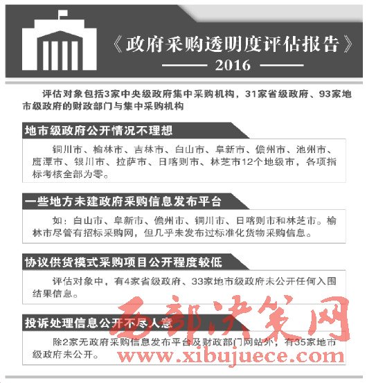 《報(bào)告》披露:我國政府采購信息公開情況仍不理想。主要表現(xiàn)為:地市級(jí)政府公開情況不佳。其中,陜西省銅川市、榆林市、吉林省吉林市、白山市、遼寧省阜新市、海南省儋州市、安徽省池州市、江西鷹潭市、寧夏銀川市以及西藏拉薩市、日喀則市和林芝市等12個(gè)地級(jí)市,在政府采購信息透明度各項(xiàng)指標(biāo)考核中全部為零分,在93家地市級(jí)政府成績排比中墊底。