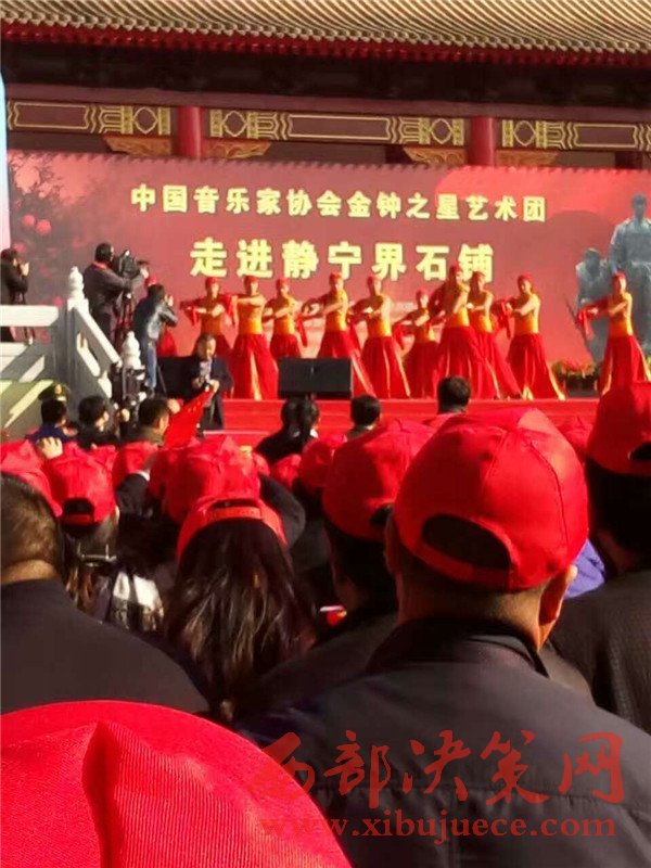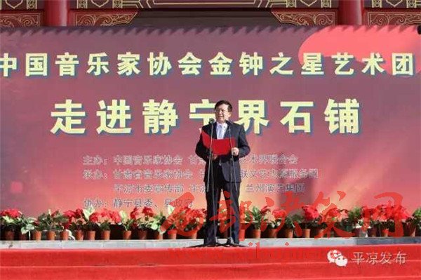 11月3日,在全國上下認(rèn)真學(xué)習(xí)貫徹黨的十八屆六中全會(huì)精神、隆重紀(jì)念紅軍長征勝利80周年之際,由中國音樂家協(xié)會(huì)、甘肅省文聯(lián)主辦,甘肅省音樂家協(xié)會(huì)、甘肅省文聯(lián)文藝志愿者服務(wù)團(tuán)、平?jīng)鍪形麄鞑?、平?jīng)鍪形穆?lián)承辦,靜寧縣委、縣政府協(xié)辦的“長征精神代代傳——中國音協(xié)金鐘之星藝術(shù)團(tuán)‘送歡樂·下基層’慰問演出活動(dòng)”在靜寧縣界石鋪紅軍長征毛澤東舊居紀(jì)念館演出。