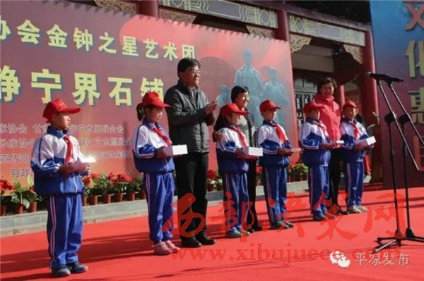 中國文聯(lián)副主席楊承志,中國音樂家協(xié)會(huì)分黨組書記、副主席、秘書長韓新安,甘肅省文聯(lián)黨組書記、副主席周麗寧向界石鋪小學(xué)捐贈(zèng)了“核心價(jià)值觀兒童歌曲”光碟和兒童樂器。演出中,蘭州演藝集團(tuán)表演了群舞《鼓舞隴原》,王二妮演唱了歌曲《趕牲靈》、《高樓萬丈平地起》,周澎演唱了歌曲《美麗中國走起來》、《旗手》,平?jīng)鰶芎觿≡罕硌萘藨蚯镀經(jīng)鲰灐?,王喆演唱了歌曲《乘夢飛翔》、《軍民團(tuán)結(jié)一家親》,湯子星演唱了歌曲《信仰的光芒》、《共圓中國夢》,吳娜演唱了歌曲《兄弟手拉手濃濃民族情》、《洪湖水浪打浪》,李進(jìn)軍表演了口技,王傳越演唱了歌曲《紅軍不怕遠(yuǎn)征難》、《我和我的祖國》,劉全和、劉全利表演了幽默小品《櫥窗模特》,呂繼宏演唱了歌曲《咱老百姓》、《甘肅老家》,宋祖英演唱了歌曲《十送紅軍》、《愛我中華》。
