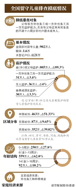 昨日,民政部發(fā)布的今年農(nóng)村留守兒童摸底排查結(jié)果顯示,全國農(nóng)村留守兒童902萬人。這902萬農(nóng)村留守兒童有805萬人沒有父母作為監(jiān)護(hù)人,是由祖父母或外祖父母監(jiān)護(hù),占比高達(dá)89.3%。