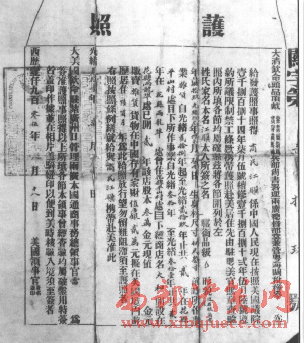 如此看來,他是一位了不起的地方富商。江驥的太和商店主要經(jīng)營雜貨貿(mào)易。因此,他向廣州政府申請去美國游歷,開開眼界。雖然1905年是美國百年排華運動的高潮年,而且美國政府明令禁止“華工”入境。就在江驥申請游美護(hù)照的前一個月,中國爆發(fā)了聲勢浩大的抵制美貨運動,其目的就是抗議美國壓迫華僑。但是,美國是允許中國商人入境游歷的,像江驥這樣的廣州富商,更是歡迎。所以,兩廣總督岑春煊會同美國駐廣州總領(lǐng)事雷伏禮在1905年8月18日分別在江驥的中國護(hù)照了簽名,準(zhǔn)許其赴美游歷。