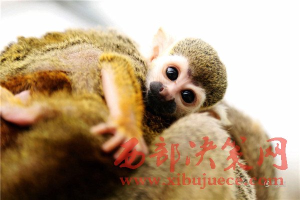 無論走到哪里松鼠猴都讓這個小家伙和自己的寶寶一起趴在自己背上玩耍、休息。