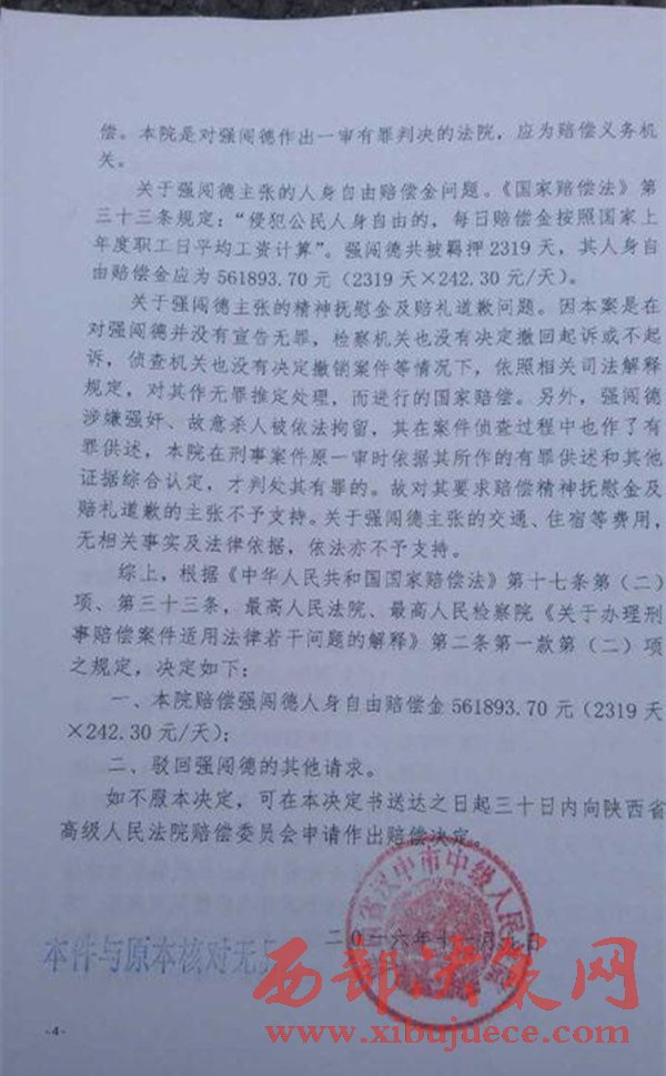2016年11月9日,陜西省漢中市中級人民法院作出國家賠償決定,國家賠償書上說,根據(jù)《中華人民共和國國家賠償法》的有關(guān)規(guī)定,決定賠償強闖德561893.70元。(強闖德共被羈押2319天,每天按242.30元賠償)。而對于強闖德提出的交通、住宿等費用,以及精神賠償?shù)纫?,不予支持?/span>