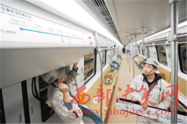 技術(shù)人員正在安裝地鐵6號線車廂設備。