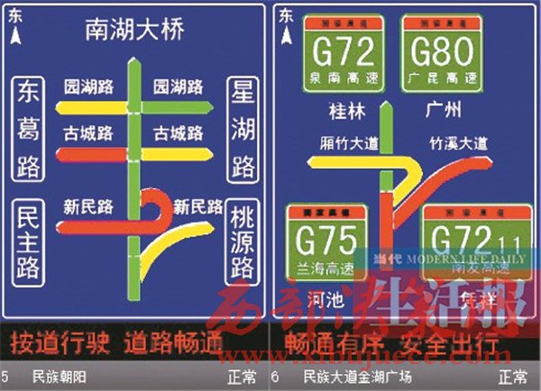 今后,駕車駛入南寧市區(qū)的司機們只要抬頭看交通誘導屏,就能看到高德地圖提供的實時路況信息,了解附近道路的擁堵狀況,并根據屏幕上各線路的顏色選擇最優(yōu)路線,做到智慧出行。