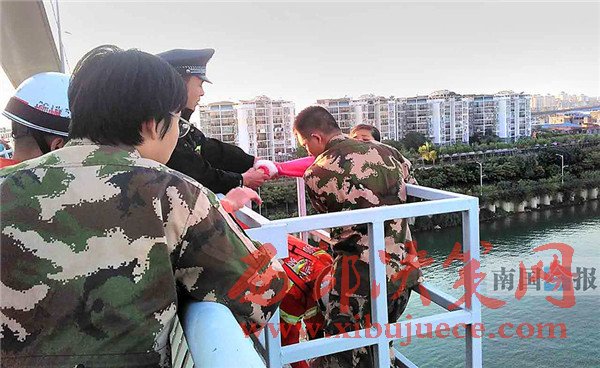 此時(shí),阿建已經(jīng)趕到橋頭,民警立即讓他先在遠(yuǎn)處等候,不要讓阿婷看見。通過阿建提供的電話號碼,民警聯(lián)系上了阿婷的父親,把電話撥通之后遞給阿婷,由其父親進(jìn)行勸說。此時(shí),在旁的消防官兵綁好救生繩索開始伺機(jī)出手。