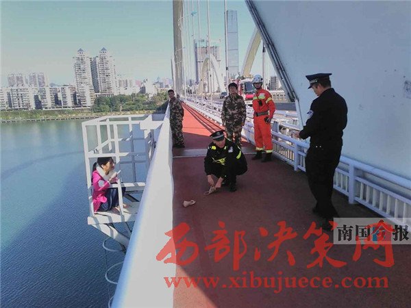 27日下午,柳州市廣雅大橋中段,有一名女子因感情問題想不開,翻越護(hù)欄想要輕生,民警和消防官兵趕到現(xiàn)場,經(jīng)過2個多小時(shí)的努力,終于抓住機(jī)會將其救下。