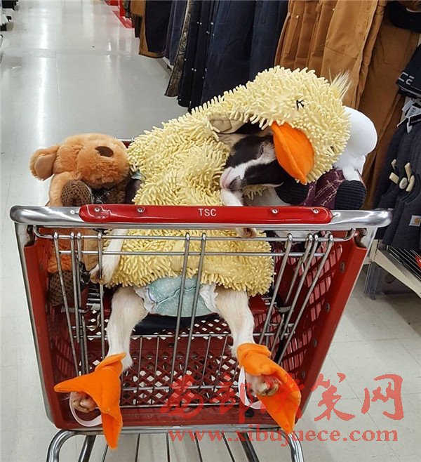 有時(shí)候琳恩出門又不能把Polly一個(gè)羊扔在家里的時(shí)候,就會(huì)給小家伙套上鴨子服,帶它出去。被打扮成鴨子的小羊在陌生的環(huán)境里也不再害怕,還在購物車?yán)锎蛄藗€(gè)小盹。