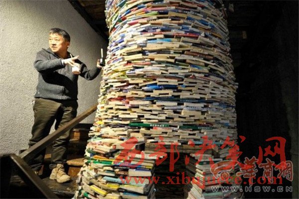 11月30日,記者在李茹的小店看到這口據(jù)稱由4噸書、近萬(wàn)本舊教輔材料制作的高7.5米、直徑1.5米的“書井”,書與書間用膠水粘貼。由于井底安裝有一盞白熾燈,從頂端向下望,的確像一塊塊磚頭砌成的深井,像墜入知識(shí)的深淵。