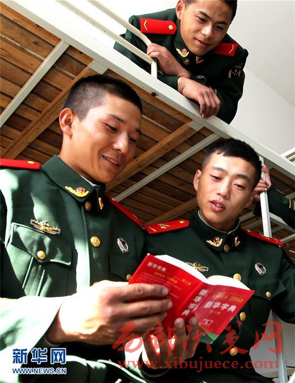 12月5日,艾麥爾·吾斯曼(左一)在連隊?wèi)?zhàn)友的幫助下學(xué)習(xí)漢語。