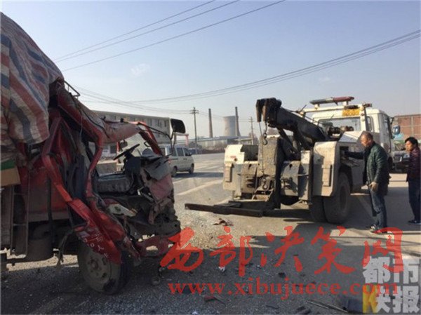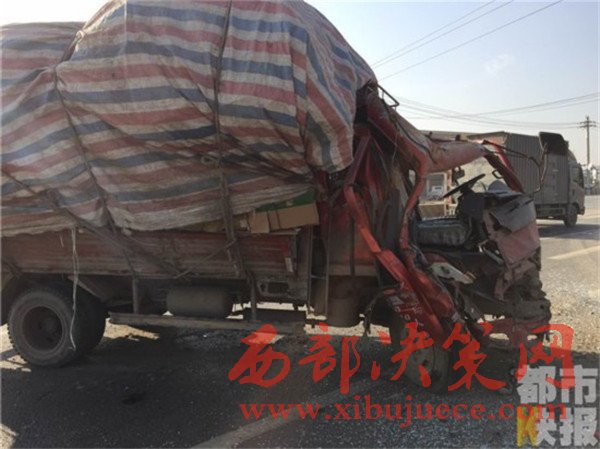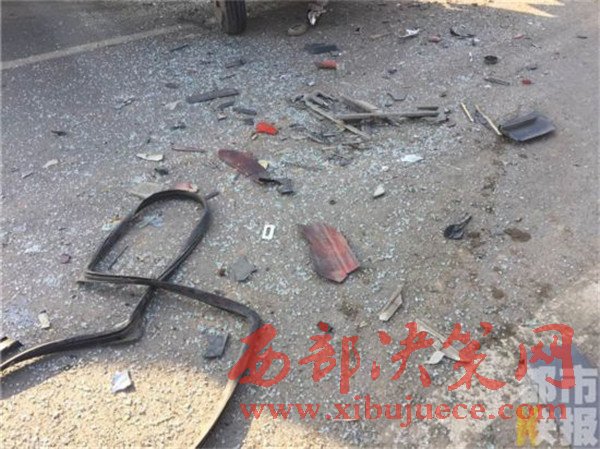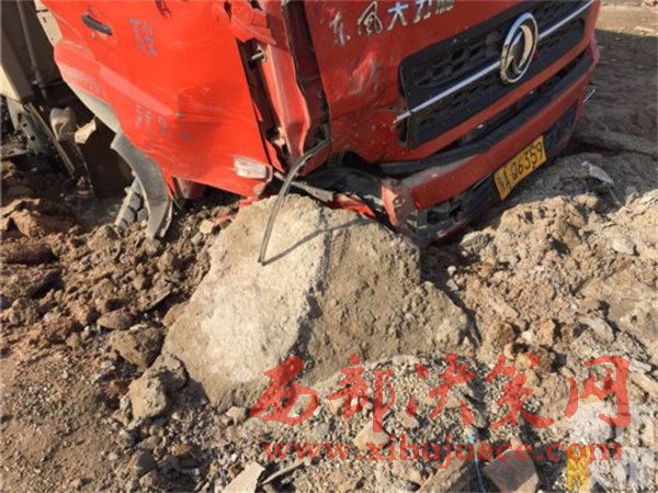 記者在事發(fā)地108國(guó)道西安市戶縣境內(nèi)看到,被撞的小貨車(chē)已經(jīng)面部全非,前部完全破損。而在這邊一輛拉沙車(chē)已經(jīng)沖到了路基下,發(fā)生傾斜。