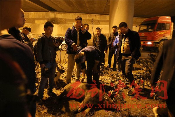 19:15,再次發(fā)現(xiàn)野豬蹤跡,它被狗攆著跑出了區(qū)政府大院,鉆到附近高速路橋下涵洞里。人群正準(zhǔn)備再次抓捕,一輛白色別克轎車駛過,“二師兄”被撞出十多米遠(yuǎn),這下再沒起來。