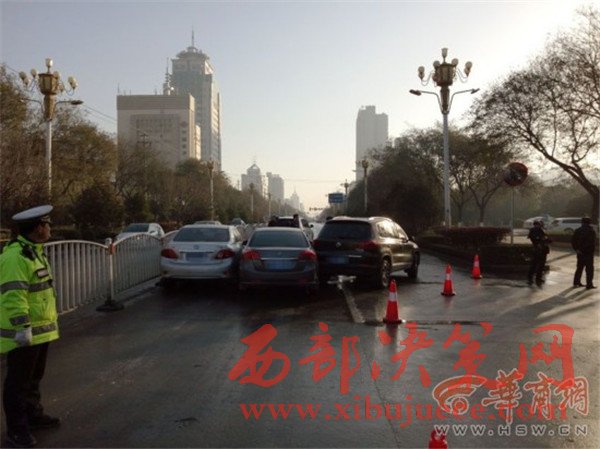 12月6日上午8時(shí)許,在渭南市區(qū)朝陽(yáng)大街與三賢路丁字以西,約300米長(zhǎng)的東向車(chē)道十分濕滑,共有16輛車(chē)接連發(fā)生交通事故