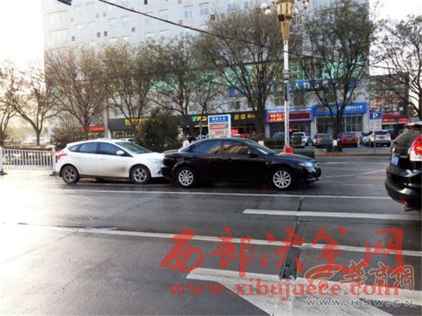 12月6日上午,在朝陽(yáng)大街與三賢路丁字,兩輛轎車(chē)因路面結(jié)冰發(fā)生追尾