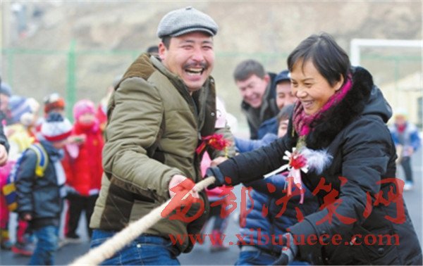 圖為11日,在大浦溝社區(qū)民族團(tuán)結(jié)廣場,居民們正在進(jìn)行拔河比賽。