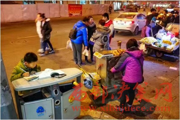 攤位旁,張女士的兒子正趴在垃圾桶上認真地寫作業(yè)。這一幕,經(jīng)常會發(fā)生在青島臺東大酒店附近。附近許多商販都知道“路邊賣烤地瓜那家”的兒子學(xué)習(xí)很用功,也特別懂事,經(jīng)常幫母親收拾貨物,照看攤位。