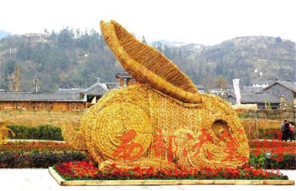 (逼真的稻雕兔子。)