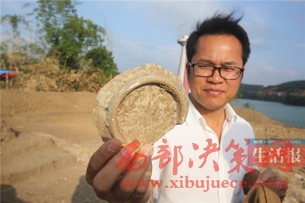 在現(xiàn)場,一工作人員給記者展示了一枚剛出土的銅錢,該枚銅錢只有人的食指般大小。據(jù)工作人員介紹,像這類的銅錢目前已經(jīng)發(fā)掘出了十枚,銅錢散落在發(fā)掘遺址的各個角落,除了銅錢外,考古人員還揭露了部分青磚砌筑的建筑基址,地層中也出土了少量的生活用陶瓷殘片。由此推斷,鎮(zhèn)江樓遺址在清代時曾有人住宿和生活過,這和史料中關(guān)于鎮(zhèn)江樓常設(shè)駐軍的記載相符。據(jù)黎文宗介紹,2014年時考古隊(duì)曾對鎮(zhèn)江樓遺址進(jìn)行全面調(diào)查,2016年開始試掘,此前,鎮(zhèn)江樓遺址因受左江南岸河岸崩塌以及老口樞紐建成水位抬升的影響,三江口鎮(zhèn)江樓遺址面臨崩塌、消亡的危險。