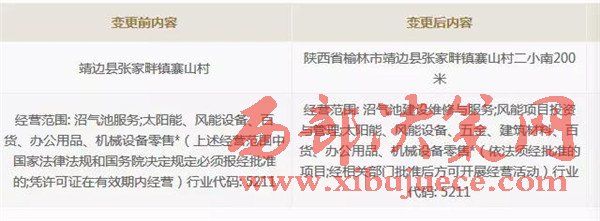 蹊蹺的是,一年半之后的2015年3月18日,靖邊興發(fā)公司突然變更了業(yè)務(wù)范圍。將原來的"沼氣池服務(wù)”,增加了四個(gè)關(guān)鍵字“建設(shè)維修”,最終變更成了“沼氣池建設(shè)維修與服務(wù)”。