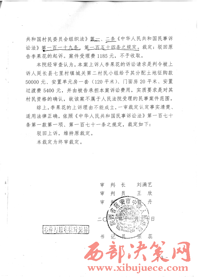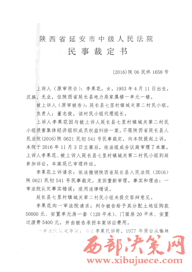記者又多次翻閱了延長(zhǎng)縣人民法院(2016)陜0621號(hào)民初541號(hào)民事裁定書(shū)和延安市中級(jí)法院(2016)陜06民終1658號(hào)民事裁定書(shū),兩級(jí)法院都用同樣的理由是:“李果花的訴訟請(qǐng)求是判令被上訴人延長(zhǎng)縣七里村鎮(zhèn)城關(guān)二村民小組給予其分配土地征購(gòu)款50000元,安置單元房一套(120平米),門(mén)面房20平米,安置過(guò)渡費(fèi)5400元,并由被告承擔(dān)案件訴訟費(fèi)用,實(shí)質(zhì)要求是對(duì)其村民資格的確認(rèn),故該案不屬于人民法院受理的民事案件范圍。”一審法院駁回起訴,二審法院是駁回上訴,維持原判。正如反映人李果花稱:“我訴訟的是要回我合法的土地征購(gòu)款、安置房、門(mén)面房、安置過(guò)渡費(fèi)。村民的資格確認(rèn),我有的合法的戶口簿、身份證,又有鎮(zhèn)政府領(lǐng)導(dǎo)、村干部、村民代表的協(xié)議書(shū)還不夠嗎?”