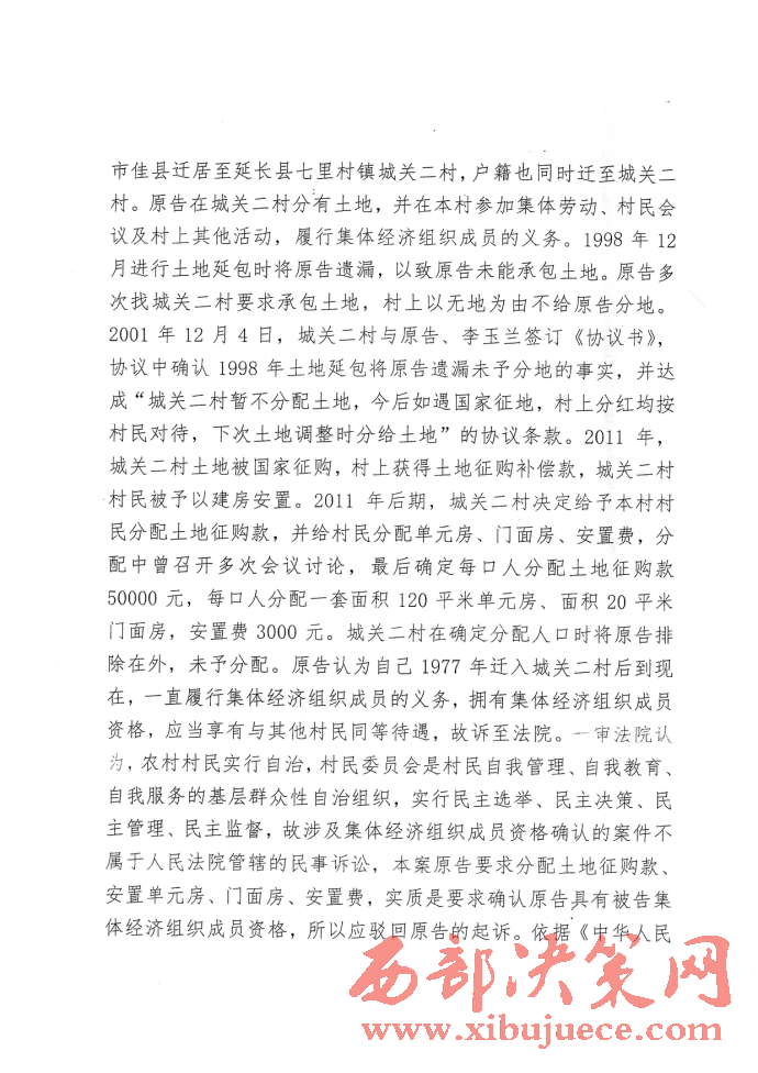 西部決策網(wǎng)訊(記者 封營(yíng)庫(kù) 實(shí)習(xí)記者 李延梅)陜西延長(zhǎng)縣七里村村民李果花反映稱:“1977年我從榆林市佳縣遷居至延長(zhǎng)縣七里村鎮(zhèn)城關(guān)二村,戶籍也同時(shí)遷至城關(guān)二村。我在城關(guān)二村分有土地,并在本村參加集體勞動(dòng)村民會(huì)議及村上其它活動(dòng),履行集體經(jīng)濟(jì)組織成員的義務(wù)。1998年12月進(jìn)行土地延包時(shí)將我遺漏,以致我未能承包土地。我多次找城關(guān)二村要求承包土地,村上以無(wú)地為由不給我分地。2001年12月4日,城關(guān)二村與我、李玉蘭簽訂《協(xié)議書(shū)》,協(xié)議中確認(rèn)1998年土地延包時(shí)將我遺漏未有分地的事實(shí),并達(dá)成“城關(guān)二村暫不分配土地,今后如遇國(guó)家征地,村上分紅均按村民對(duì)待,下次土地調(diào)整時(shí)分給土地”的協(xié)議條款。2011年,城關(guān)二村土地被國(guó)家征購(gòu),村上獲得土地征購(gòu)補(bǔ)償款,城關(guān)二村村民被予以建安置房。2011年后期,城關(guān)二村決定給予本村村民分配土地征購(gòu)款,并給村民分配單元房、門(mén)面房、安置費(fèi),分配中曾召開(kāi)多次會(huì)議討論,最后確定每口人分配土地征購(gòu)款50000元,每口人分配一套面積120平米單元房,面積20平米的門(mén)面房,安置費(fèi)5000元,城關(guān)二村在確定人口時(shí)將我排除在外,未予分配。我認(rèn)為自己1977年遷入城關(guān)二村后到現(xiàn)在,一直履行集體經(jīng)濟(jì)組織成員的義務(wù),擁有集體經(jīng)濟(jì)組織成員資格,應(yīng)當(dāng)享有與其他村民同等待遇,故訴至延長(zhǎng)縣人民法院要求判令城關(guān)二村給予我分配土地征購(gòu)款50000元,安置單元房一套(120平米)、門(mén)面房20平米,安置過(guò)渡費(fèi)5400元。但被延長(zhǎng)縣人民法院以涉及集體經(jīng)濟(jì)組織成員資格的案件不屬于人民法院管轄的民事訴訟,駁回起訴。我又上訴至延安市中級(jí)人民法院,但又用同樣的理由又被駁回上訴。我該怎么辦?真的天下烏鴉一般黑嗎?我訴訟的是要回屬于我的征地款、安置房、過(guò)渡費(fèi),我有合法的戶口簿、身份證。又有延長(zhǎng)縣城關(guān)鎮(zhèn)政府副鎮(zhèn)長(zhǎng)張世杰、包村片長(zhǎng)趙華強(qiáng)、包村干部白醫(yī)學(xué)、城關(guān)村村主任(二村村民)董志軍、二村村長(zhǎng)趙金星,原二村會(huì)計(jì)王連平,原二村代表老村長(zhǎng)丁興元,在鎮(zhèn)政府會(huì)議室簽訂的協(xié)議書(shū)。難道我的村民資格還要確認(rèn)嗎?我村村長(zhǎng)董志軍的兒子董飛戶口也不在我村,又是公務(wù)員,現(xiàn)任延長(zhǎng)縣紀(jì)律檢查委員會(huì)案件審理室主任,還有村長(zhǎng)董志軍他父親。董長(zhǎng)春早已去世,但也同樣分的征地補(bǔ)償款,安置單元房,安置過(guò)渡費(fèi)。望你們新聞媒體深入調(diào)查,將事實(shí)公布于眾,為我申冤,維護(hù)我的合法權(quán)益。”