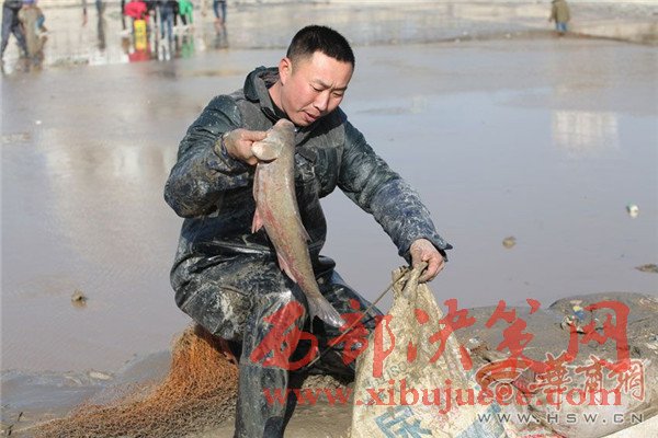 橋上釣魚(yú)人忙得不亦樂(lè)乎,橋下?lián)启~(yú)者也是爭(zhēng)先恐后。咸陽(yáng)湖橡膠壩附近,不少市民拎著袋子和塑料桶在石縫里尋找殘留的小魚(yú)。比起這些撿小魚(yú)的市民,橡膠壩下面水洼處的幾名捕魚(yú)人則要更專業(yè)一些,他們下到水里,用力將網(wǎng)甩出去,一網(wǎng)子下去最少也有10多條大魚(yú)。有些人沒(méi)有撈到魚(yú),便現(xiàn)場(chǎng)從捕魚(yú)人手里花上10元或20元,買(mǎi)上一條大魚(yú)心滿意足地回家去了。