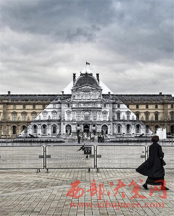 利用攝影技術(shù),法國街頭藝術(shù)家JR讓巴黎盧浮宮前著名的玻璃金字塔消失了。當從一個精確的角度看過去,金字塔真的不見了,我們得以見到盧浮宮驚人的“真面目”。