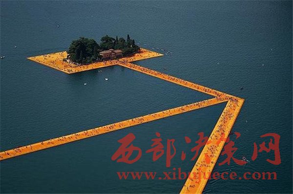 當代概念藝術(shù)家Christo因開拓土地藝術(shù)而聞名。在他最新的項目漂浮碼頭中,Christo搭建了很多亮黃色的小路,邀請意大利Sulzano的居民和游客步行通勤至別的導(dǎo)語。和Christo的其他裝置一樣,漂浮碼頭作品中的其他地方景觀也扮演著重要的角色。“湖周圍的山脈提供了鳥瞰該作品的地點,展現(xiàn)了那些之前沒被注意的角度”,他解釋道。“水、風、太陽,都是這個項目的一部分。”