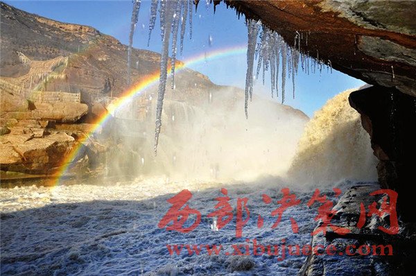 近日,受降溫天氣影響,位于山西吉縣和陜西宜川縣交界的黃河壺口瀑布出現(xiàn)冰掛彩虹景觀(guān)。