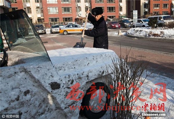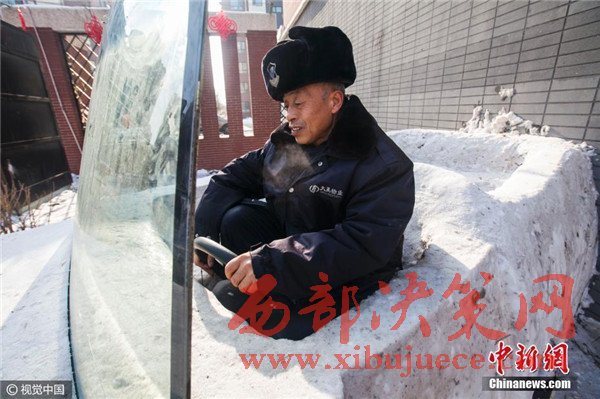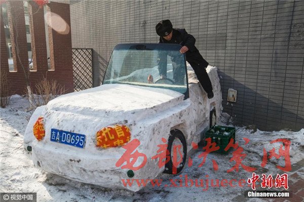 1月3日,吉林省長春市,六旬保安組團建雪雕汽車,上車下車用啤酒箱當(dāng)踏板。