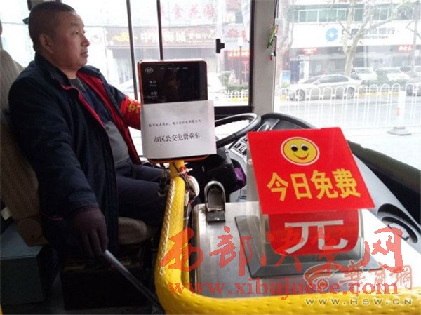 昨日,咸陽(yáng)城區(qū)公交車(chē)上的票箱口及刷卡機(jī)刷卡面板上分別貼著“今日免費(fèi)”字樣的提示牌