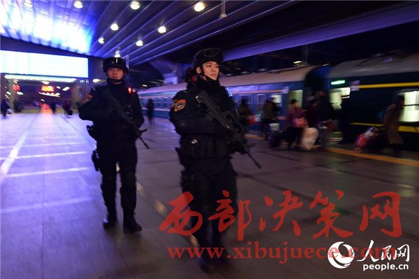 1月13日,站臺(tái)上,正在執(zhí)勤的特警。