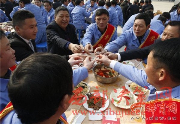 張興民介紹,在為大家發(fā)放了1600萬的工資后,工地上還為農民工返鄉(xiāng)之前準備了聚餐。每個桌上不僅有自釀的“苞谷燒”,還有八涼兩熱的菜品,同時按照陜西風俗習慣準備的有大燴菜,僅大燴菜里面的肉都有500多斤,希望以此方式來感謝農民工兄弟一年多的辛苦!