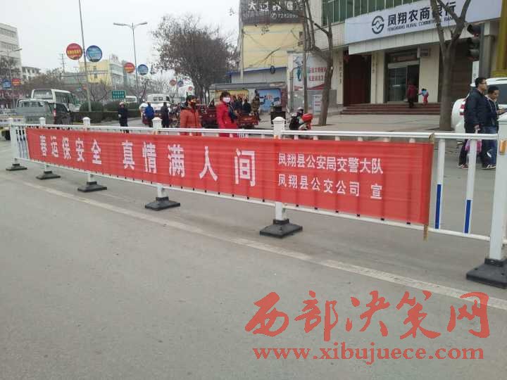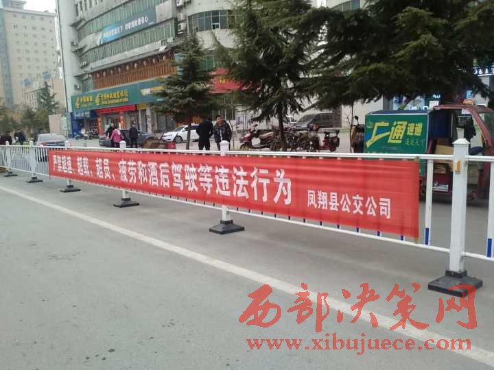 西部決策網(wǎng)訊(帥華鋒 李亮亮 通訊員 孟歡)為切實做好2017年春運期間道路交通安全宣傳工作,引導(dǎo)群眾安全、文明出行,營造和諧、平安的春運道路交通安全氛圍。近日,鳳翔大隊根據(jù)汽車客運站、鎮(zhèn)街要道春運期間人流車流量較大的特點,將印有“文明交通你我他,平安出行靠大家”、“祝千家萬戶家家團圓  愿四方旅客路路平安”、“秩序保障安全,規(guī)則守護生命”、“滴酒不沾,一路平安”等交通安全宣傳標(biāo)語的橫幅懸掛在東大街、南大街、東大街、秦鳳路等主干道防護欄醒目位置,為春運安全行駛營造濃厚的宣傳氛圍。
