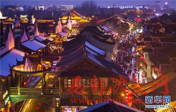 2月2日晚,山東省棗莊市臺兒莊古城景區(qū)燈光璀璨,游人如織。