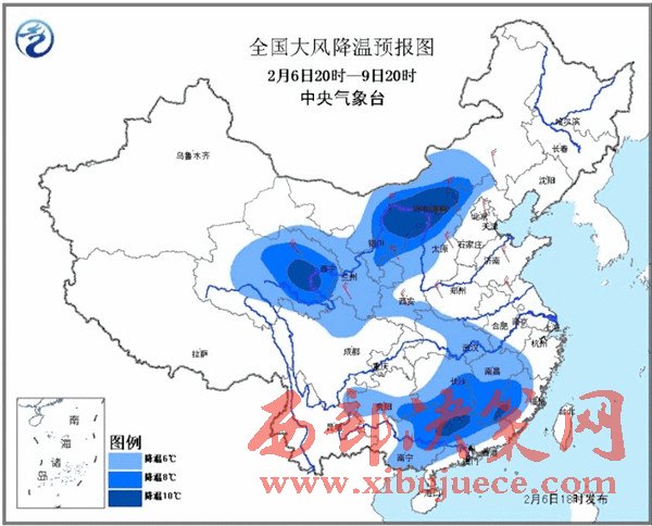 中央氣象臺預計,6日夜間至9日,我國中東部大部地區(qū)都將自北向南將先后出現(xiàn)大范圍大風降溫和雨雪天氣,平均氣溫將普遍下降4℃以上,其中,青海東部、陜西北部、內(nèi)蒙古中部、山西北部、貴州東南部、湖南中南部、江西中南部、福建西部、廣西北部和廣東北部等地氣溫將下降8℃以上,局地超過10℃!長江以北地區(qū)并伴有4——6級偏北風,東部和南部海區(qū)風力有7——9級。