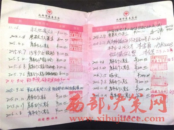 從賑災(zāi)捐款,到為愛助醫(yī),從公眾熟知的“提燈女孩”王思培,到無人注意的早產(chǎn)雙胞胎,成都慈善總會(huì)為廖弟友發(fā)放的捐款證書上,每一頁都記著受助者的名字和個(gè)人基金的用途。翻看捐款證書,僅從2011年3月到2016年12月這段時(shí)間內(nèi),廖弟友的捐款次數(shù)達(dá)到58次,最近一次是2016年12月存入個(gè)人慈善基金的記錄。