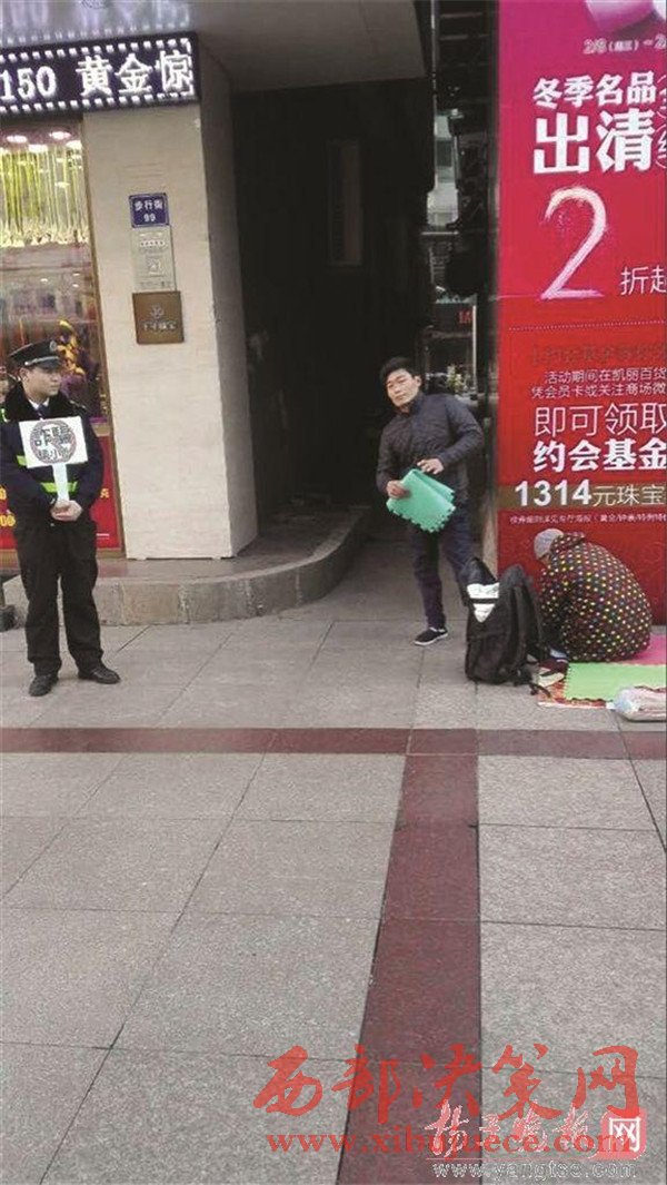 14日下午,揚(yáng)子晚報記者來到了張家港步行街,聯(lián)系上了當(dāng)時舉牌子的城管協(xié)管員曾欽國和他的同伴趙峰。據(jù)了解,事發(fā)于2月11日下午1點40分左右,巡崗隊員發(fā)現(xiàn),一名行乞的男子出現(xiàn)在主街和一條小弄堂的交叉口,曾欽國和趙峰收到消息后立馬往現(xiàn)場趕,曾欽國說:"當(dāng)天是元宵節(jié),又是周末,步行街非常熱鬧,人流量非常大。"二人趕到現(xiàn)場后發(fā)現(xiàn),一名男子跪在地上,旁邊躺著一位閉眼婦女,婦女的身底下墊了一層泡沫板,身上蓋了一條薄被。